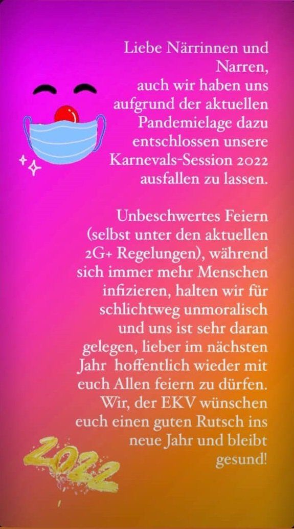 Daher hat der Vorstand des EKV schweren Herzens entschieden, dass es in Eitelborn im Jahre 2021 keine Kappensitzung und auch keinen Rosenmontagsumzug geben wird. Somit wird die Session 2020/2021 ausfallen.